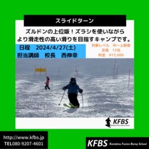 お申込方法:神立フュージョンバンプスクールホームページより申込→『RESERVE』申込フォームへ移動→日付を指定→ご希望欄に(スライドターン)と記入し、必要事項を記入しお申込み下さい。
